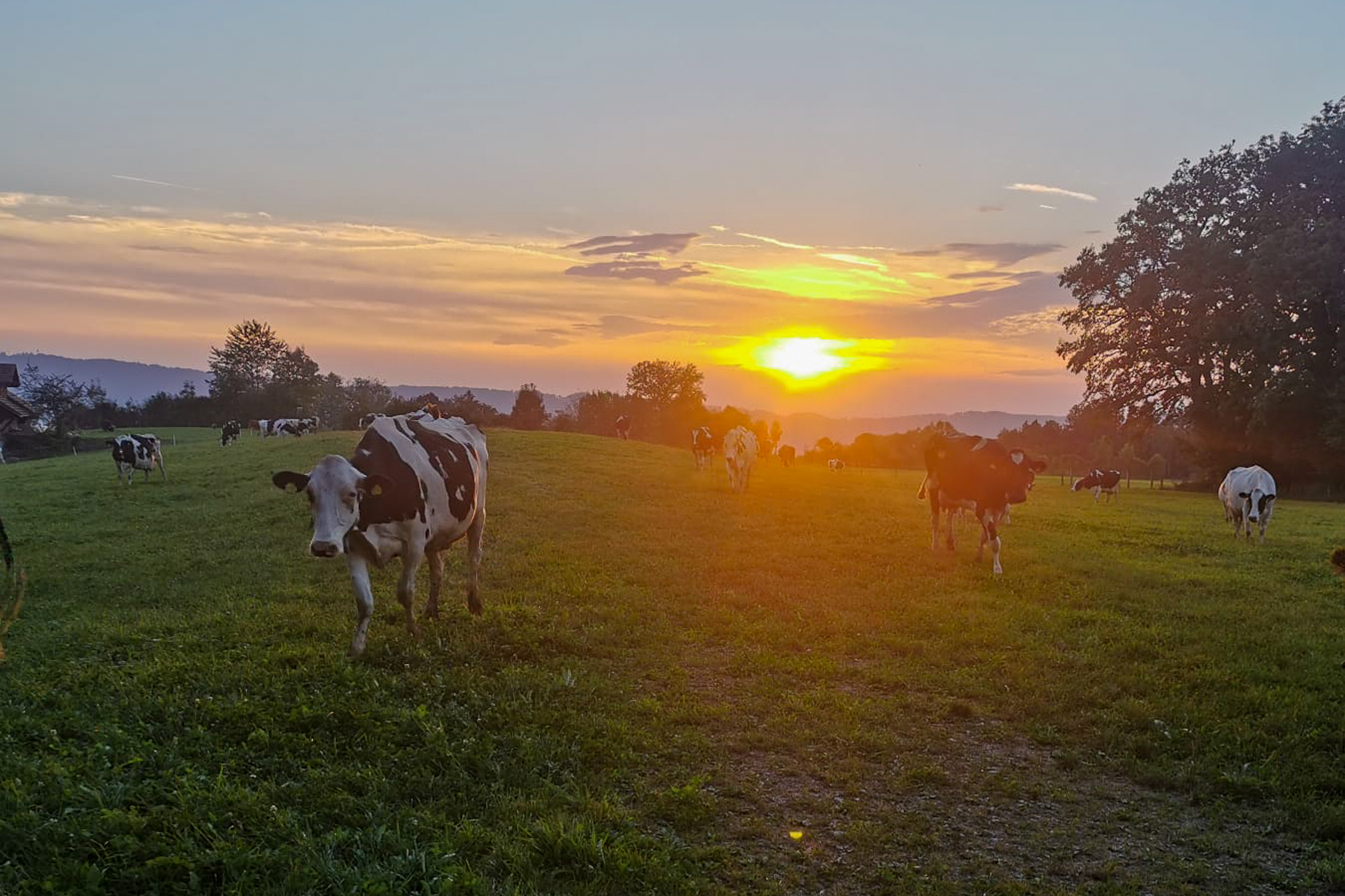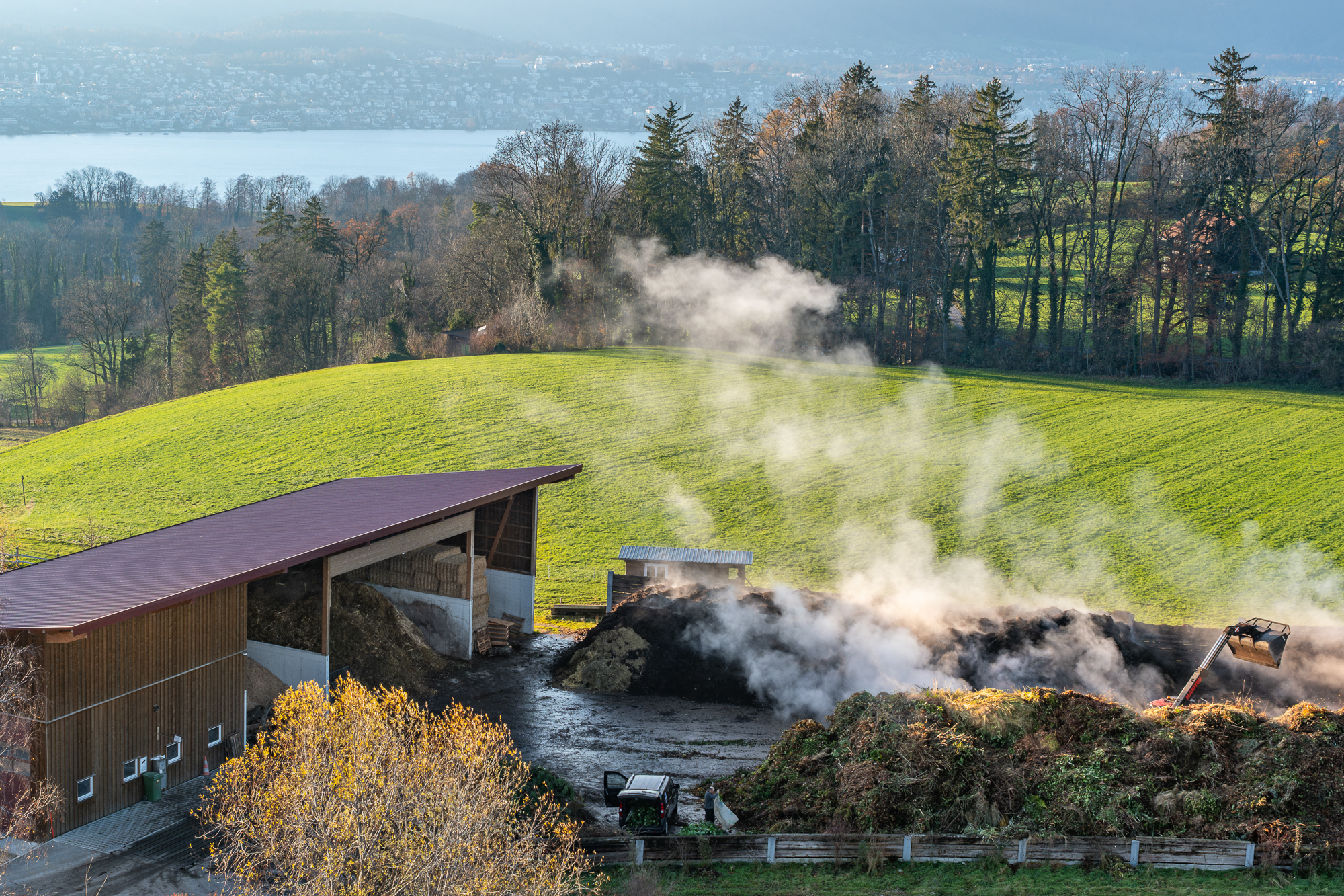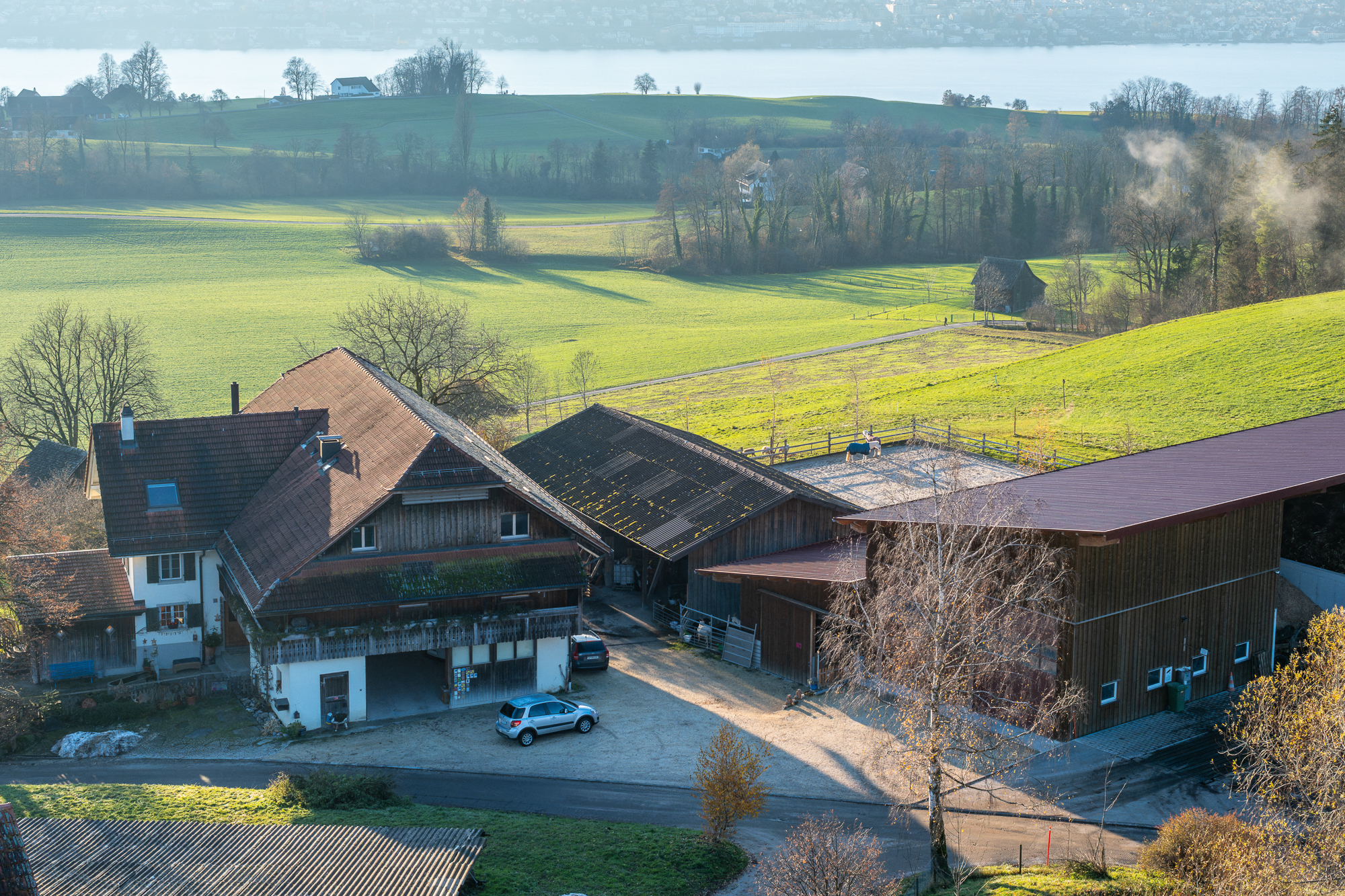 Oberhalb von Herrliberg, in der malerischen Hügellandschaft des Pfannenstiels, liegt der Hof Etter. Auf diesem besonders schönen Flecken Erde mit Aussicht auf den Zürichsee lebt unsere Familie gemeinsam mit Holstein Milchkühen, Schafen, Pferden, Ponys und Hunden. In den vergangenen Jahren haben wir unseren Hof zu einem vielseitigen, modernen Landwirtschaftsbetrieb entwickelt. Neben der Milchwirtschaft betreiben wir einen öffentlichen Kompostplatz, auf dem Gärtnereien, Gartenbauunternehmen und Privatpersonen ihre Grünabfälle abgeben können. Ein kleiner aber feiner Pferde-Pensionsstall rundet das Angebot ab.